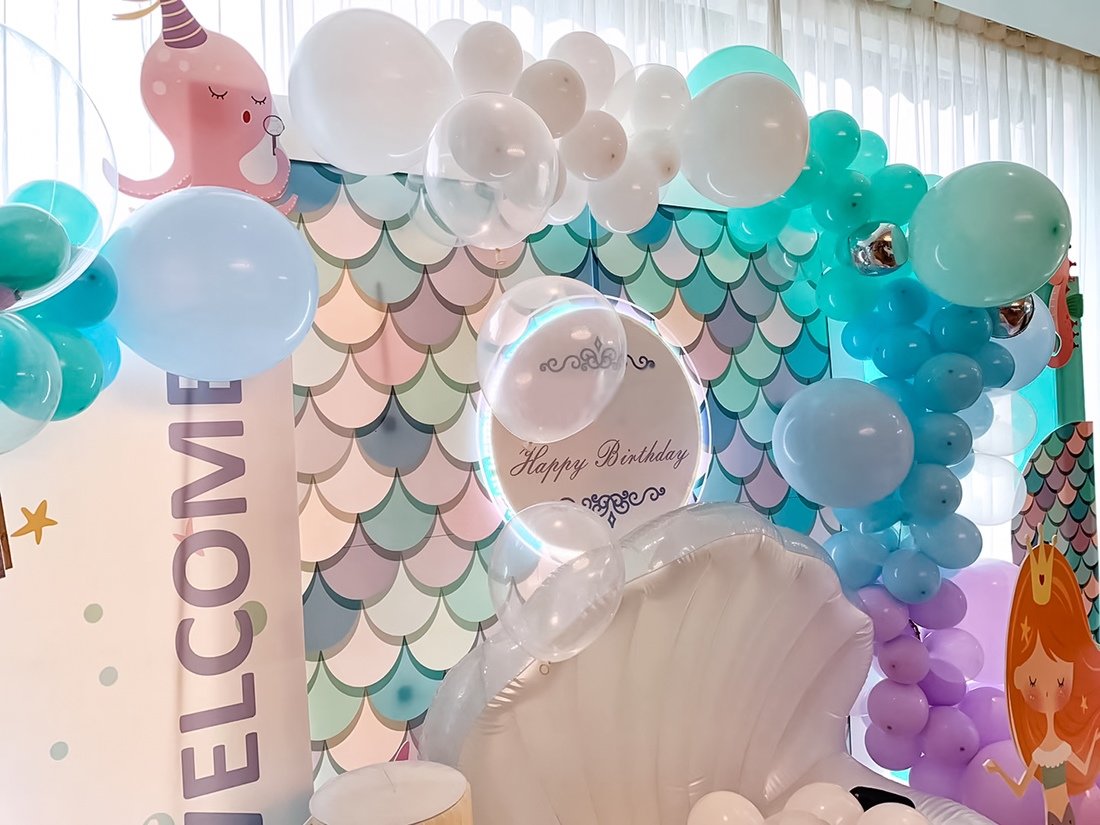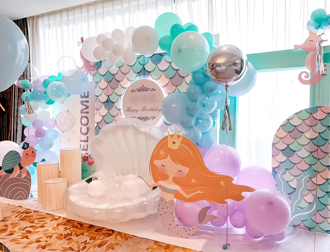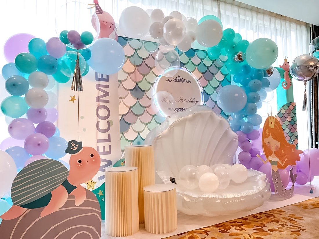 淡蓝海洋色系梦幻的美人鱼主题生日派对布置