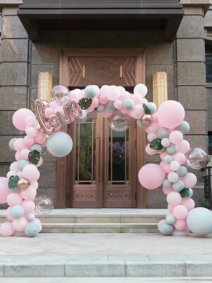 浅灰色搭配浅粉色的气球绑出浪漫结婚气球拱